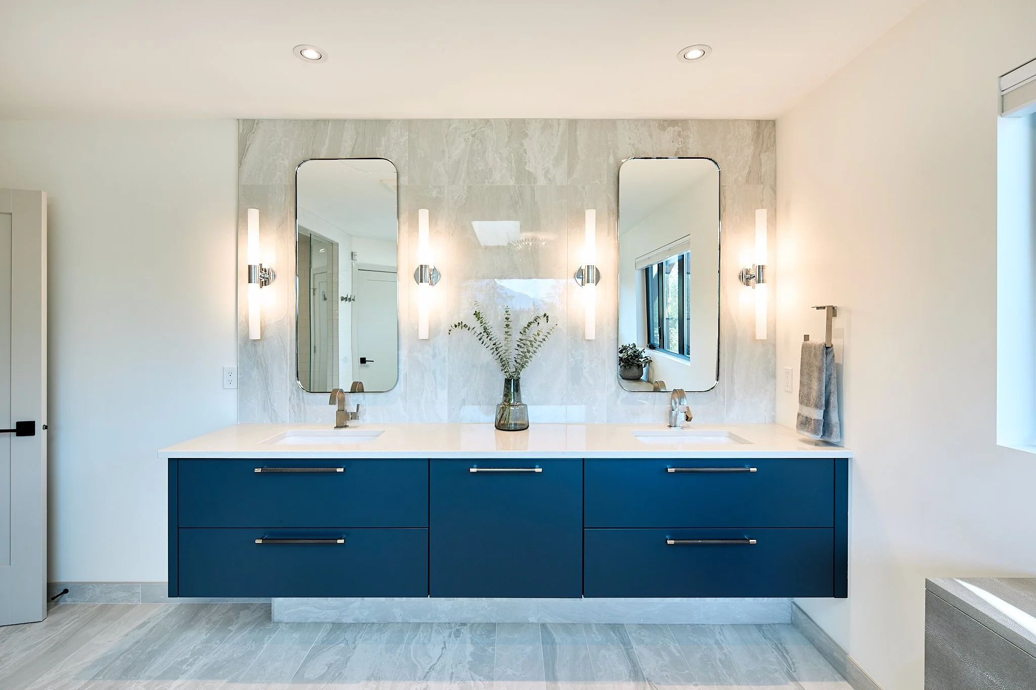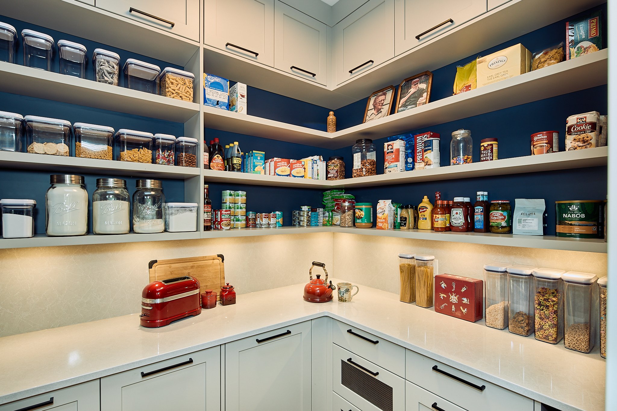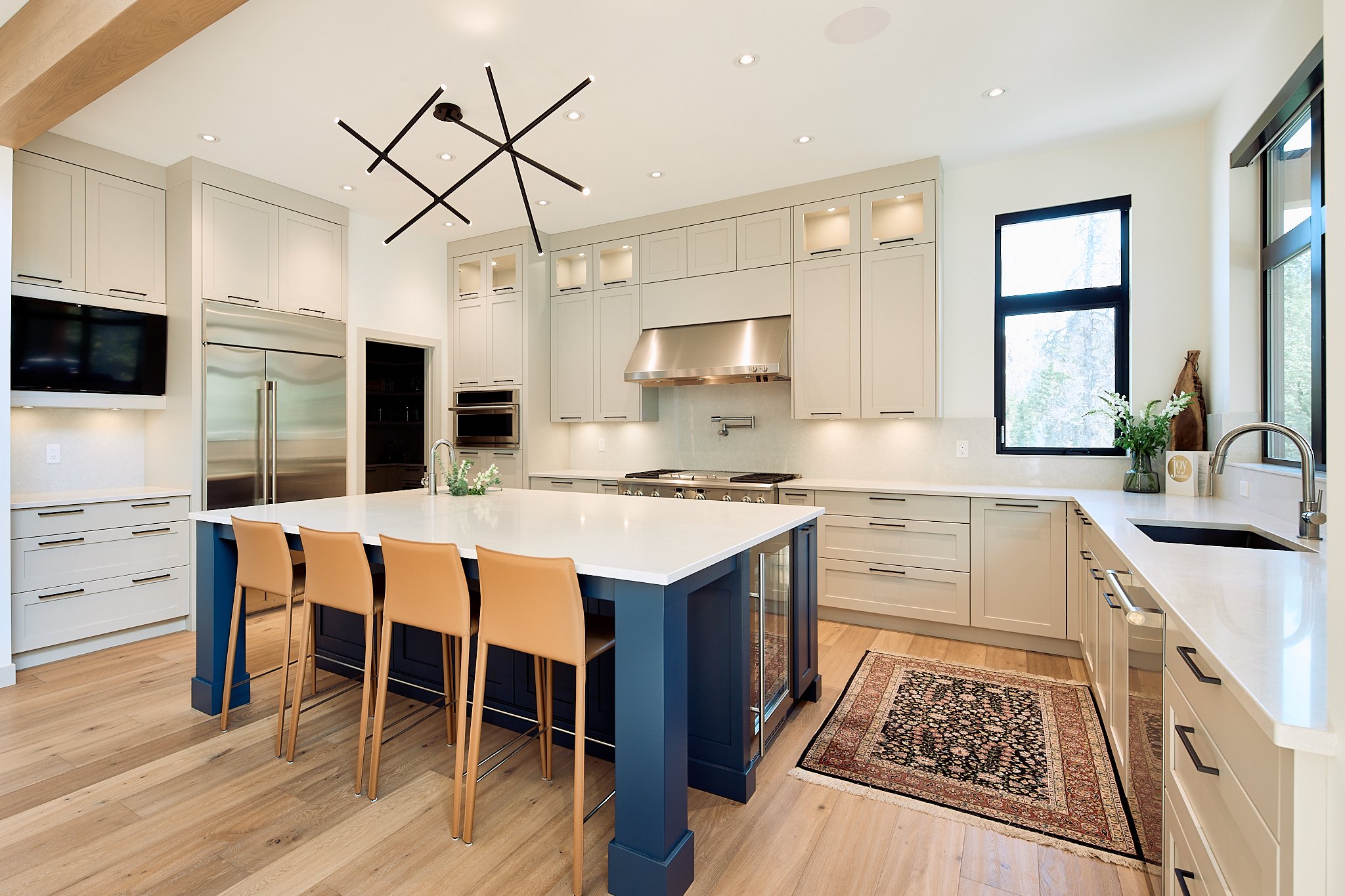 That same thoughtful approach carries through the mudroom, laundry, and pantry, where custom storage and tailored shelving make everyday living feel effortless. Even the bathroom cabinetry adds a fresh, contemporary touch with its rich blue finish. Together, these spaces reflect a home designed with clarity, craftsmanship, and a confident modern style.