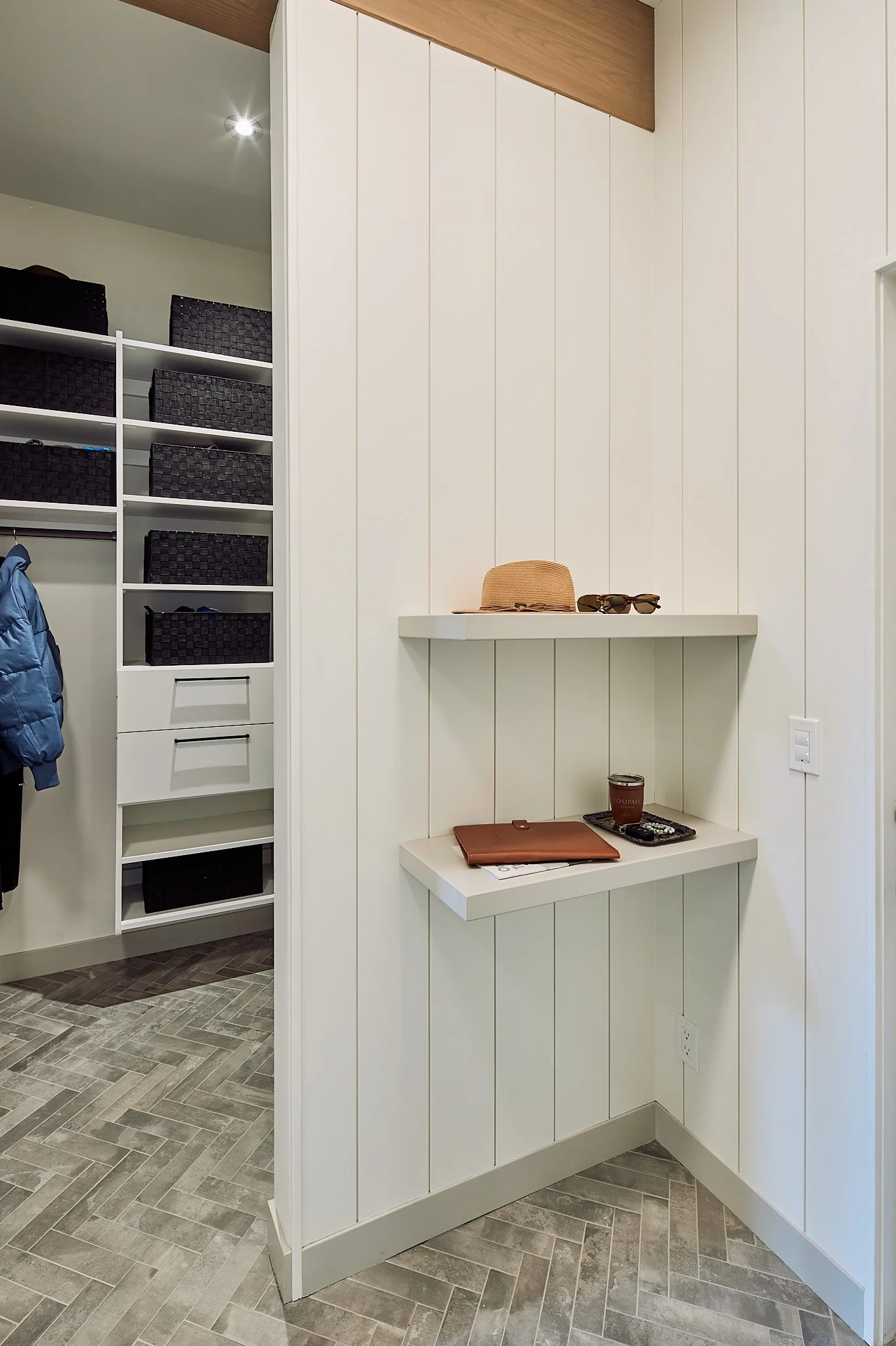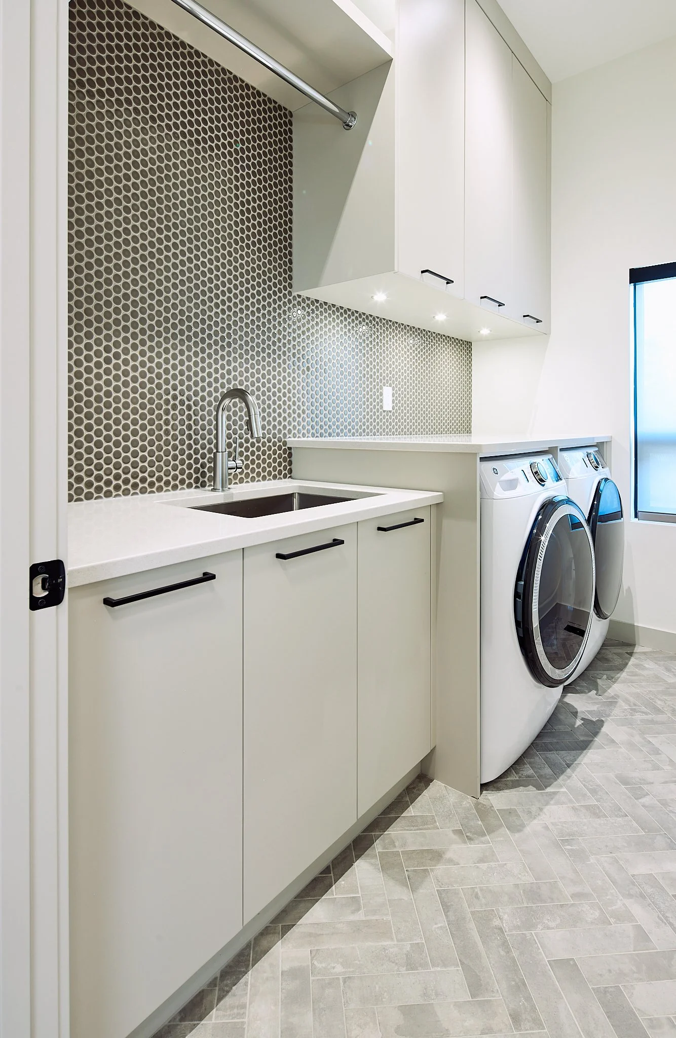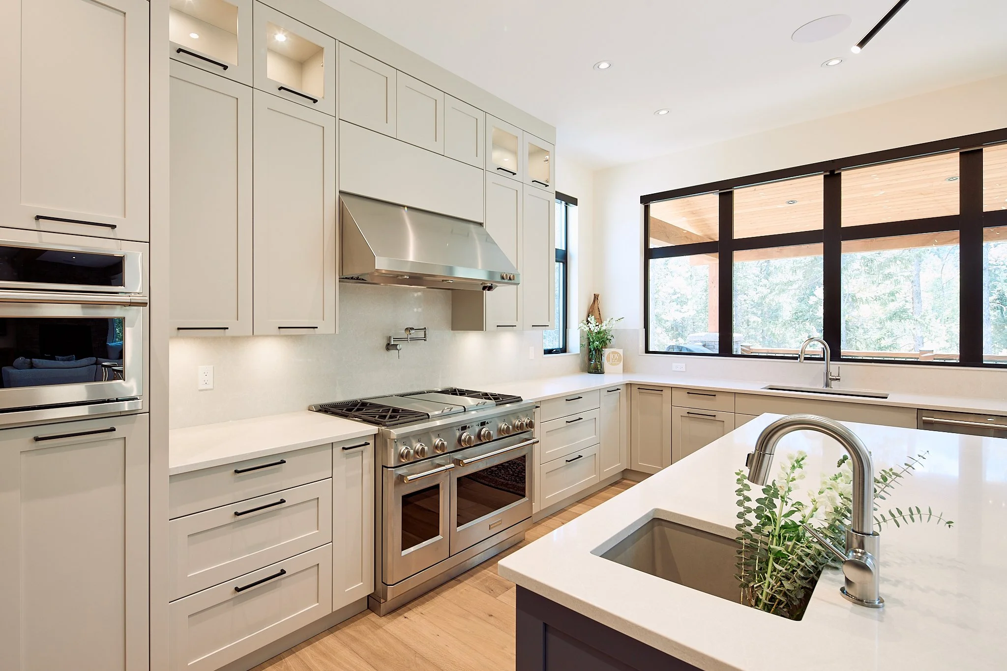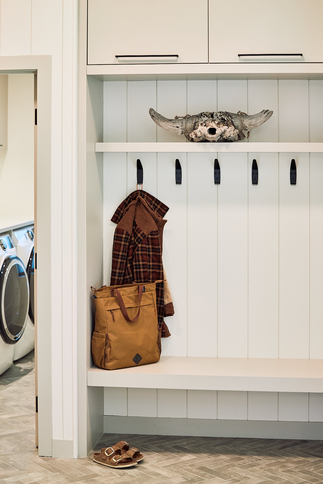 That same thoughtful approach carries through the mudroom, laundry, and pantry, where custom storage and tailored shelving make everyday living feel effortless. Even the bathroom cabinetry adds a fresh, contemporary touch with its rich blue finish. Together, these spaces reflect a home designed with clarity, craftsmanship, and a confident modern style.