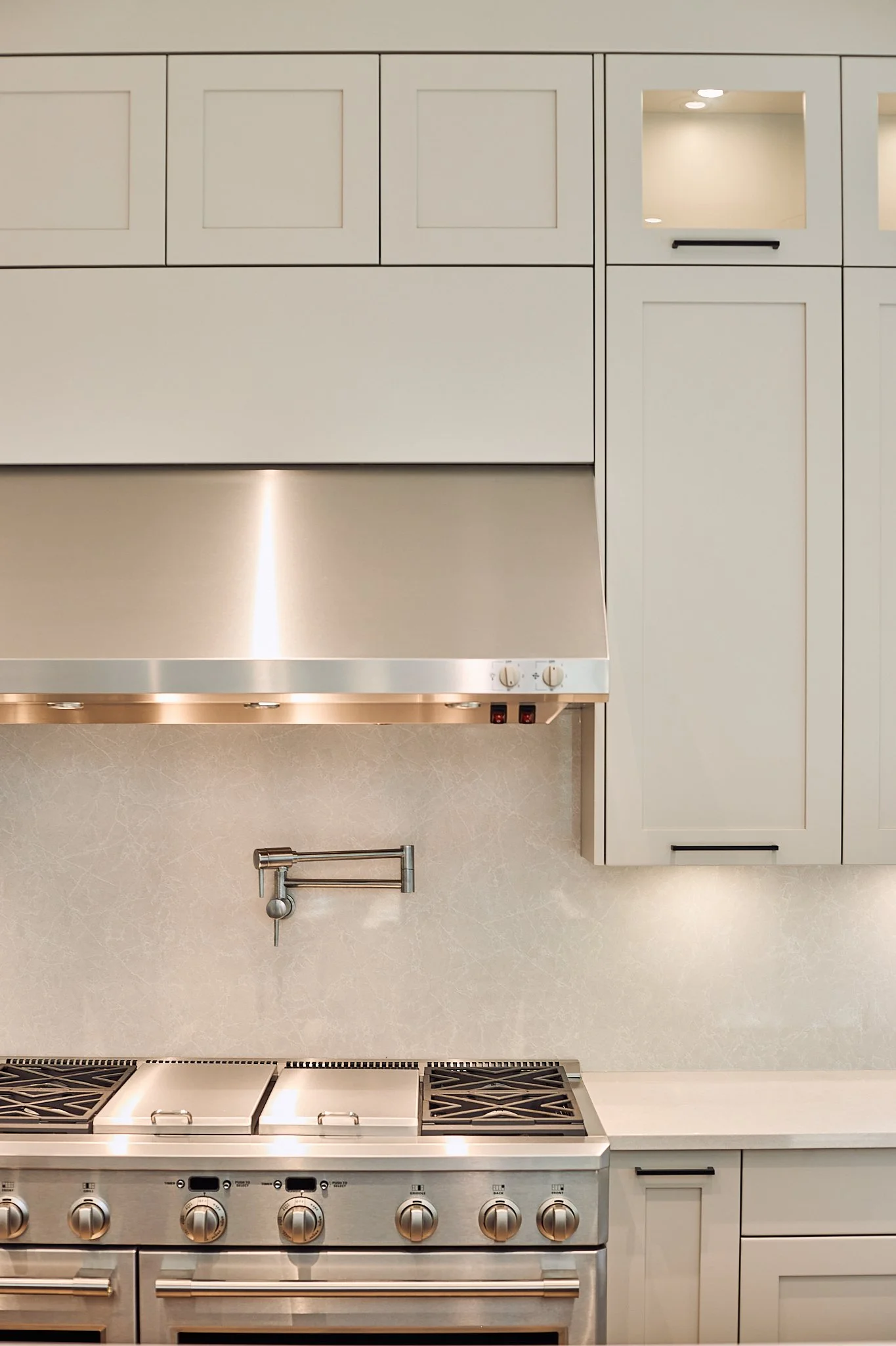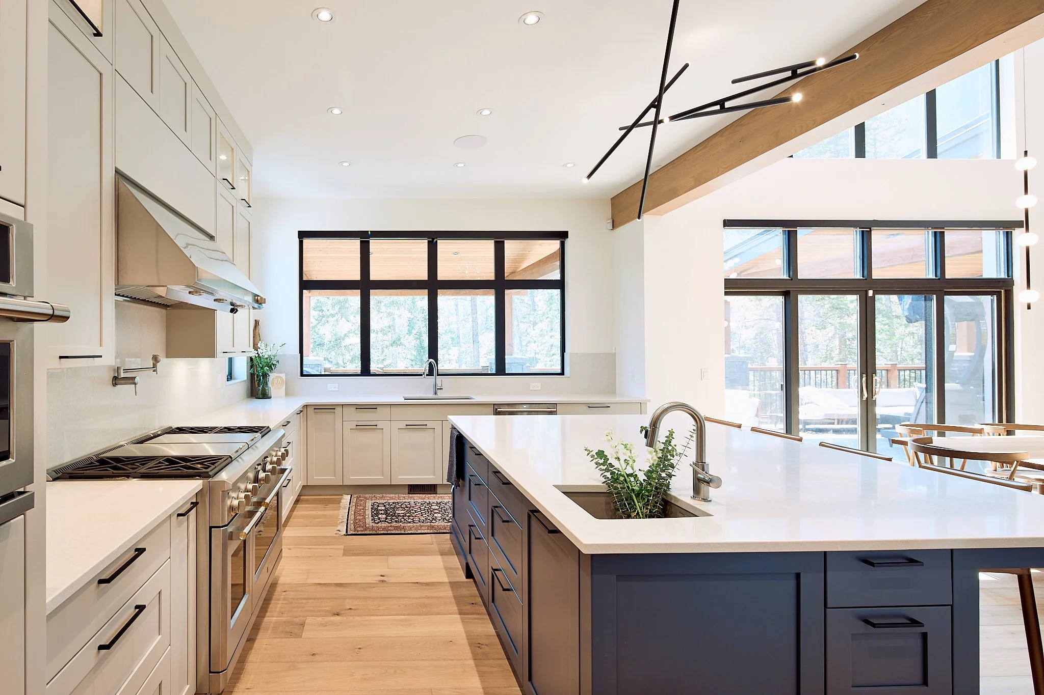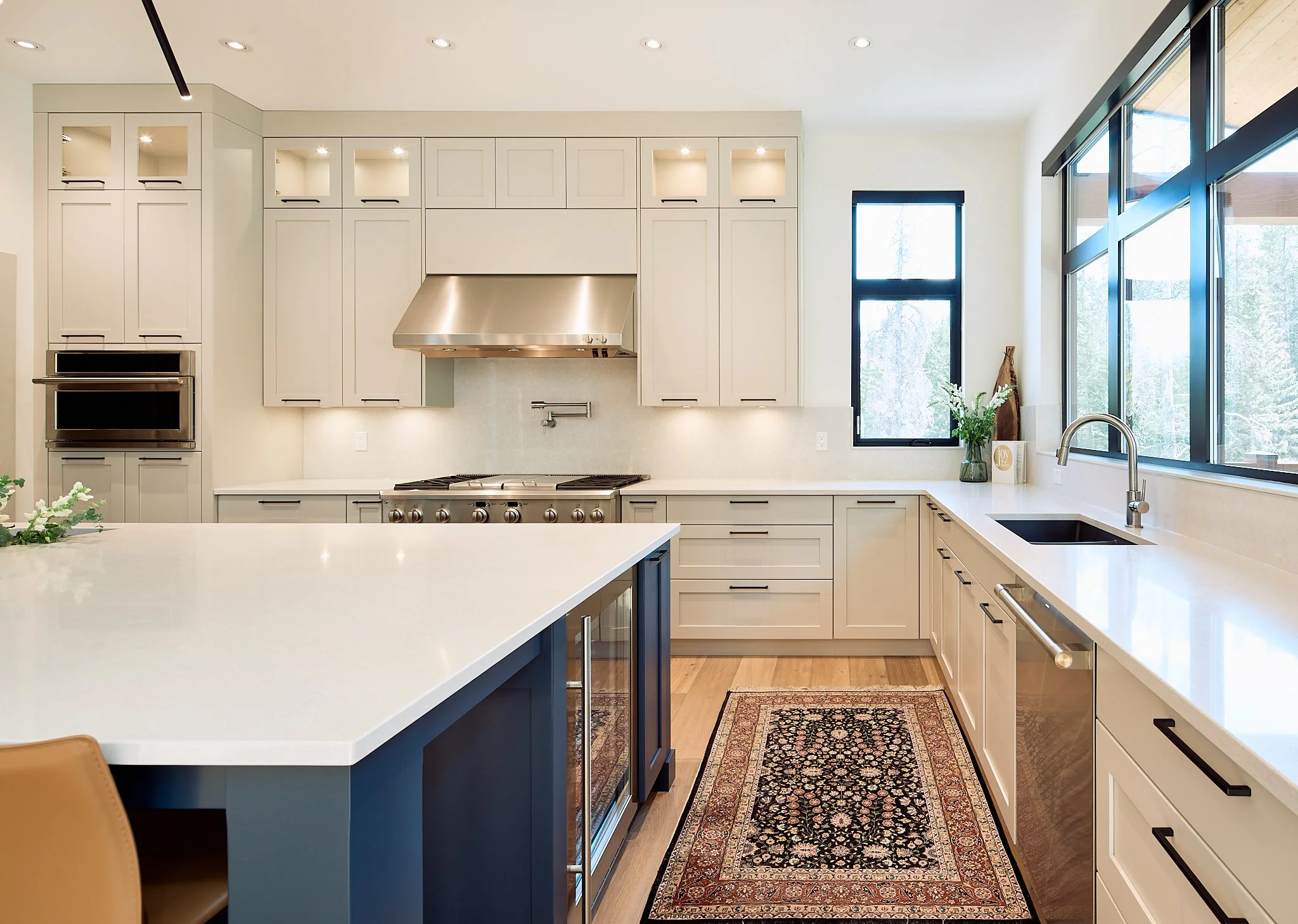 This home pairs bright, modern design with cabinetry that brings warmth, function, and cohesion to every space. The kitchen features soft white cabinets balanced by a bold blue island and warm wood accents, creating a clean yet inviting centerpiece.