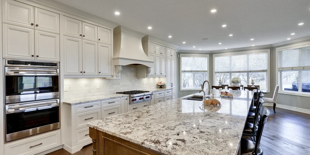 Bright white kitchen cabinets with marble island, stainless steel appliances, and recessed lighting